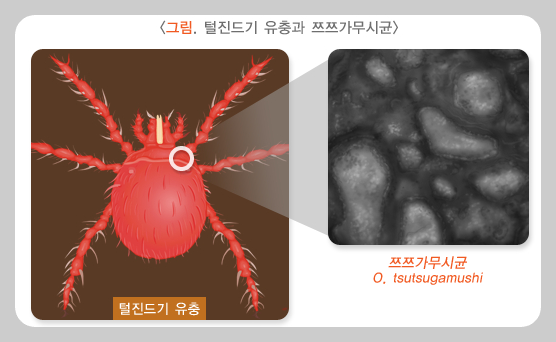 쯔쯔가무시병은 진드기티푸스, 덤불티푸스, 초원열, 잡목열 등으로도 불리는 발열성 질환입니다. 오리엔티아 쯔쯔가무시(Orientia tsutsugamushi)에 감염된 털진드기의 유충이 사람을 물면 그 미생물