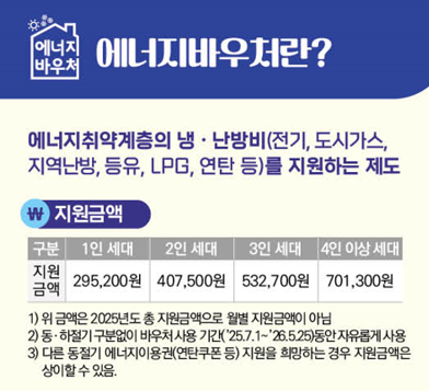 2025년 에너지바우처는 에너지 사용이 취약한 국민이 여름에는 전기요금, 겨울에는 전기·도시가스·지역난방·등유·LPG·연탄 등을 구입할 수 있도록 돕는 정부 에너지 지원제도입니다.