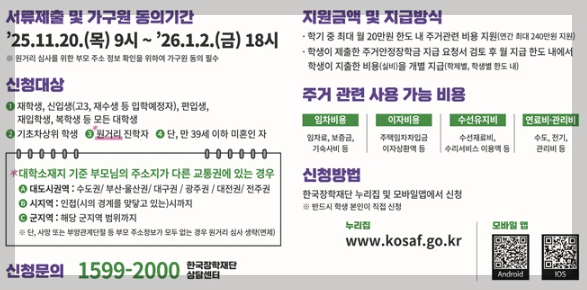 특히 지방에서 대학을 다니는 학생이나 자취·기숙사 생활 중인 학생에게 실질적 도움을 주도록 설계되어 있습니다.