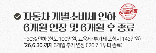 2026년 현재 기준으로 정부는 자동차 개별소비세 인하 조치를 6개월 연장했습니다.