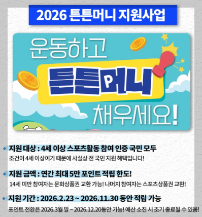 2026년 현재 많은 사람들이 주목하고 있는 ‘튼튼머니 지원사업’은 스포츠 활동을 인증하면 포인트를 지급하는 대표적인 건강 인센티브 제도입니다.
