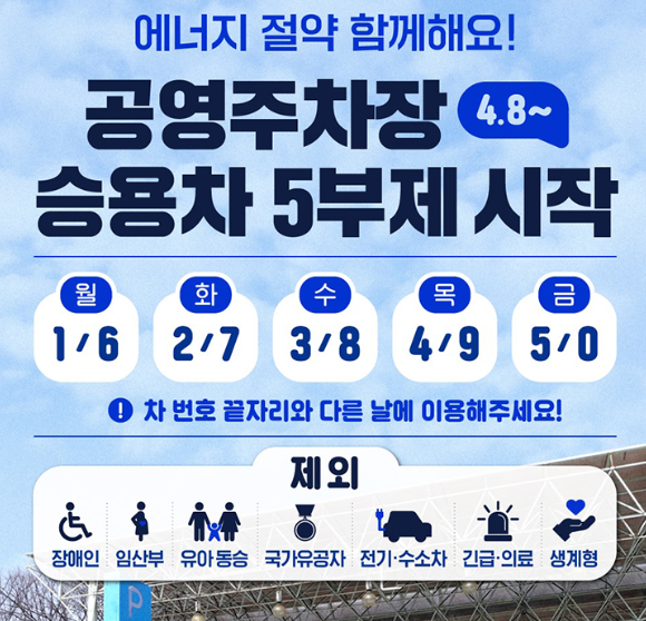 공영주차장 5부제는 차량번호 끝자리를 기준으로 특정 요일에 공영주차장 이용을 제한하는 제도입니다.