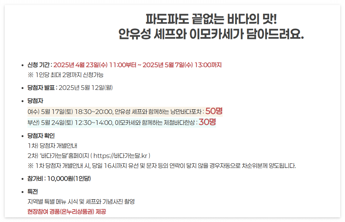 ✅ 셰프의 바다밥상 당첨자는 초청 일정에 맞춰 행사장 방문