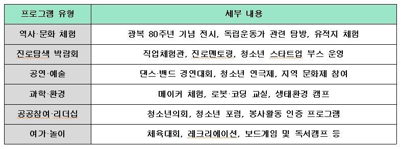 광복 80주년이라는 역사적 해를 맞아, 청소년들이 우리 역사를 되새기고 민주시민으로서의 정체성을 다질 수 있도록 역사 교육과 현장 체험 프로그램이 비중 있게 편성되었습니다.
